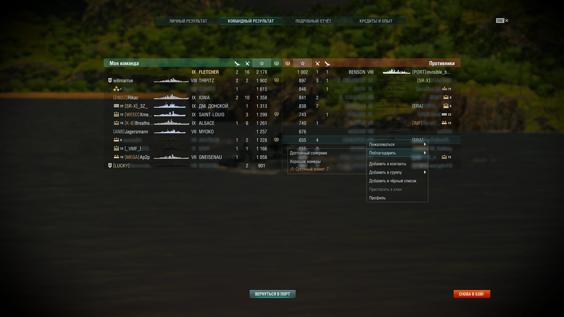 2 101 [FLD] KoT__86REG Старший альфа-тестер, Коллекционер 7 556 публикаций 4 373 боя Жалоба #99 Опубликовано: 10 апр 2018, 12:25:28 Сегодня в 17:17:41 пользователь Heais2 сказал: Подходит? Тогда разочарую. Это мой аккаунт. И насчёт Флетчера уверен. С шестыми он не играет. Ну, значит играешь ты мягко говоря ниочинь, раз у тебя эсм от авиков страдает. А то что 6 может с 9, или 7 с 10 играть- зря не веришь. Ракоотряды еще никто не отменил 1 Рассказать о публикации Ссылка на публикацию