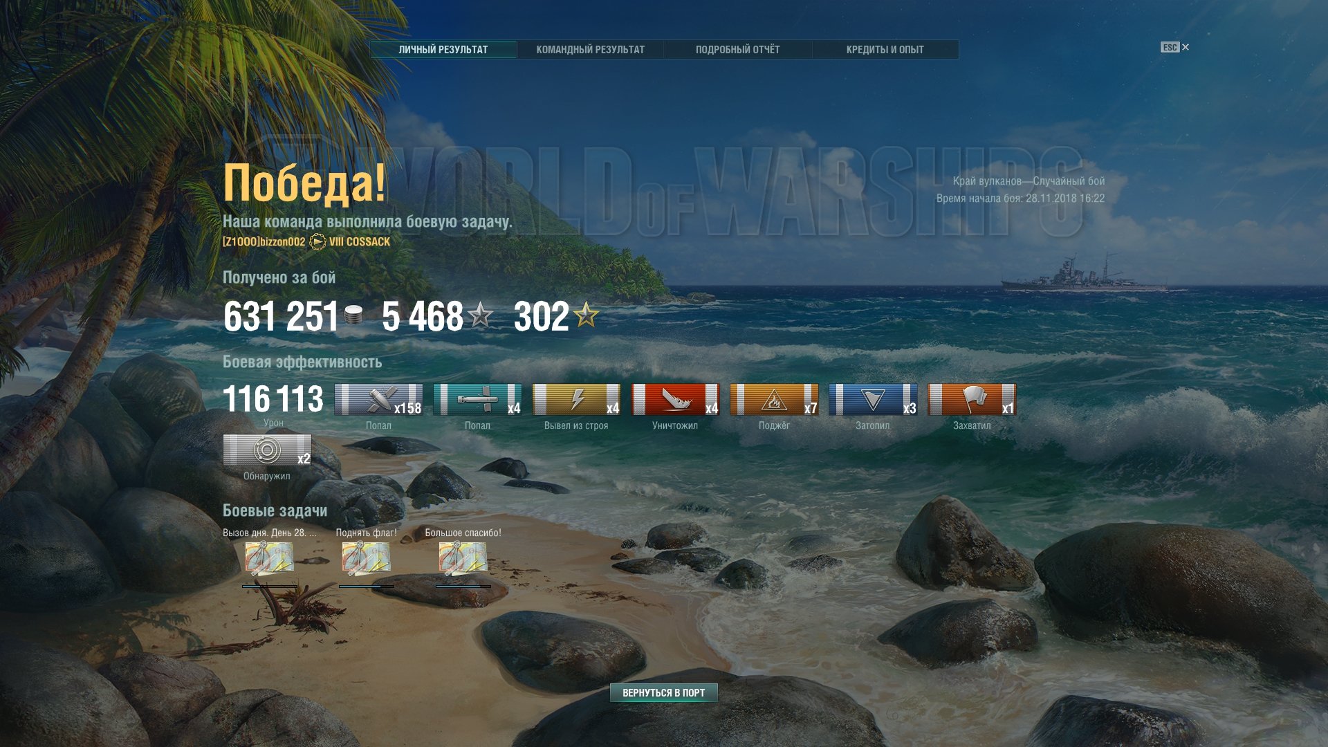 на Козаке главное иметь железные нервы и не слиться на старте.. в этот момент его главное оружие - засвет и толковые сокомандники сзади... он шикарен "на добивании" чтоб быстро снять 3-5к последних с вражины…   ну и понимать, что практически любой эсминец твой оппонент - ИНДИВИДУАЛЕН.