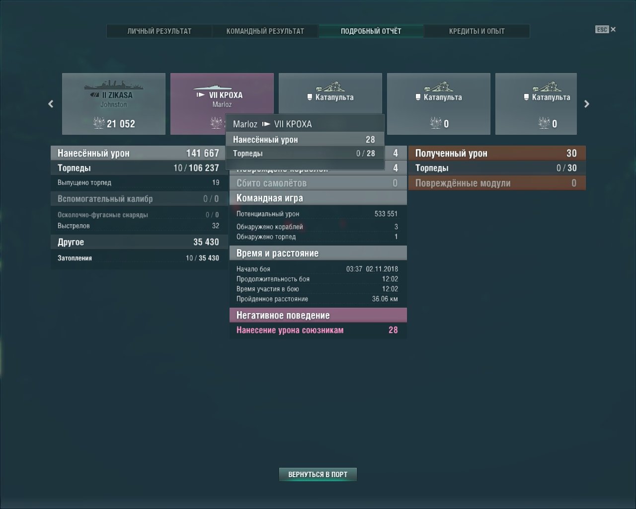 14 786 Ssupersvintuss Участник, Коллекционер 13 082 публикации Жалоба #119 Опубликовано: 17 ноя 2018, 12:53:43 Возник вопрос - как быть с тимдамагом в операции "ужас глубин". По идее он полностью отключён, но тем не менее попадая в союзника торпедой(или принимая его) кое-какой дамаг всё таки проходит. Причём такое впечатление, что дамагает исключительно сплэшем при взрывах(а прямого урона действительно нет). Да, это копейки - но тем не менее. Более того, один раз словив союзную торпеду, получил крит двигателя. Вот пример: Скрытый текст Мне-то в принципе всё равно(на бой это практически не влияет), а вот для тех кто заходит в операции отмыться от "розовости" может быть критично. Рассказать о публикации Ссылка на публикацию