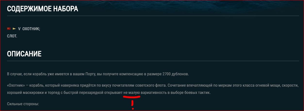 17 953 [SK] Mebius_lW Бета-тестер, Коллекционер, Мододел 6 968 публикаций Жалоба #389 Опубликовано: 23 июл 2019, 14:06:50 В 21.07.2019 в 21:21:37 пользователь BloodySword сказал: Получил очень интересное сочетание наград. Урон от попадания с ваншотом из ГК засчитали на счёт ПМК ПМК с перком РуПМК тоже вёл огонь, но эсминец был утоплен главным калибром. Или я чего-то не понял или это какой-то баг... Скрины прилагаю, может пригодятся разработчикам: Скрытый текст Приветствую! Ситуация конечно интересная, но вполне реальная. Сплеш от взрыва снаряда ПМК вызвал детонацию корабля противника, поэтому нет попадания и есть цифры урона в послебоевой статистике. На момент попадания боеспособность эсминца была ниже отметки в 75%, при этом отсутствовал флажный сигнал "Juliet Charlie". В 21.07.2019 в 06:00:01 пользователь VitalyBigMC сказал: В описании "Охотника" в прем.магазине клиента игры - ошибка. В данном контексте "немалую" пишется слитно. Скрытый текст Спасибо за репорт, исправим. 1 Рассказать о публикации Ссылка на публикацию