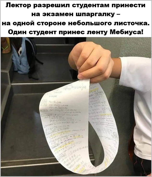 176 181 [FLD] kapitan1212 Бета-тестер 97 820 публикаций 16 149 боёв Жалоба #47331 Опубликовано: 10 июн 2025, 02:53:02 Сегодня в 00:07:25 пользователь aucMAH сказал: Фторник!!! Послезавтра выдохной!!! Фсем трям. Вставайти уже - сколько можно спать?! 1...10...11...100...101 – вышел зайчик погулять. Скрыть содержимое Скрыть содержимое . Академика Капицу спросили: - Как разделить 800 гр *** на троих? - Каждому налить по 100 гр, а поллитра на троих – это уже классическая задача, решённая много раз. Скрыть содержимое Как в пустыне посадить льва в клетку: МЕТОД ЯДЕРНОЙ ФИЗИКИ. Помещаем кота в клетку и применяем к нему и льву вне клетки обменный оператор Гейзенберга, который обменивает спины. Всё, лев в клетке. ТЕРМОДИНАМИЧЕСКИЙ МЕТОД. Через пустыню натянем полупроницаемую мембрану, которая пропускает через себя всё, кроме льва. МЕТОД ИНВЕРСИВНОЙ ГЕОМЕТРИИ. Помещаем в заданную точку пустыни клетку, входим в неё и запираемся изнутри. Производим инверсию пространства по отношению к клетке. Теперь лев внутри клетки, а мы – снаружи. МЕТОД ШРЁДИНГЕРА. В любом случае существует положительная, отличная от нуля вероятность, что лев сам окажется в клетке. Сидите и ждите. Скрыть содержимое Физик-теоретик пытается забить в стену гвоздь шляпкой вперед. К нему подходит другой теоретик: - Я понял в чем причина вашей неудачи, коллега, это гвоздь от противоположной стены! Скрыть содержимое История открытий ядерной физики: До нашей эры – не могли открыть и не открыли. В XVIII веке – могли бы открыть, но не открыли. С 1895 по 1911 год – открыли, но не заметили. С 1911 по 1920 год – заметили, но не заинтересовались. С 1920 по сегодняшний день – Вау! Ничего себе! Вот это да! Скрыть содержимое Один студент МГУ спрашивает другого: - Что за книгу ты читаешь? - Это «Квантовая физика». - Почему тогда вверх ногами? - А какая разница... Скрыть содержимое Начальник технарь, говорит подчинённым гуманитариям: - У меня радостная новость! С сегодняшнего дня у вас у всех зарплата увеличилась в 0,9 раз... Скрыть содержимое Работаю ведущим инженером в КБ. Приехав домой в отпуск, все сразу бегут с вопросами, мотивируя их «ты ж инженер». Один спрашивает про стартер (подойдет от другой модели или нет), мотивация – «ты ж инженер» и должен знать. Другой спрашивает про угол наклона крыши теплицы, мотивация – «ты ж инженер» и должен знать. Но недавно был новый хит, заходит соседка и просит провести свадьбу дочери. Удивленно спрашиваю: - А я-то тут причем, я ж вроде «инженер». - Так ВЕДУЩИЙ ж, – парировала соседка. Скрыть содержимое Гульельмо Маркони наконец-то изобрел свой «первый в мире» радиоприемник и первое, что он услышал, были слова Александра Попова: «Приём, приём, кто слышит, отзовитесь…». Скрыть содержимое Скрыть содержимое Физики тоже немного лирики: Был этот мир глубокой тьмой окутан. Да будет свет! И вот явился Ньютон. Но сатана недолго ждал реванша. Пришел Эйнштейн – и стало всё, как раньше. Скрыть содержимое Студента-физика спросили: - Что такое «трёхфазная сеть»? - Ну, когда по одному проводу идёт ток, по второму напряжение, а по третьему косинус Фи. Скрыть содержимое Истина ТБ, написанная кровью: - Чем больше рабочих, которые плохо относятся к технике безопасности, тем меньше рабочих, которые плохо относятся к технике безопасности. Скрыть содержимое Скрыть содержимое Любой живой электрик, автоматически считается хорошим. Скрыть содержимое На свете сущес