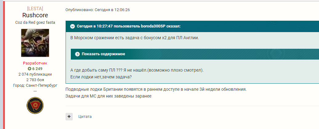 287 [UMKA] Slotburg Старший альфа-тестер 698 публикаций Жалоба #49 Опубликовано: 22 фев 2023, 14:10:00 (изменено) Сегодня в 14:12:33 пользователь Panzer_krabe сказал: Я ошибся. Но это не спасет эту лодку. Что толку от того, что торпед много, если попасть ими будет нереально? Она будет очень токсичной, ее будут ненавидеть, но от ее торпед просто будут уезжать. 42 узла - некоторые эсминцы их обгонят. Токсичной, возможно... но, время покажет. Как заядлый подводник, скажу, что главный враг ПЛ - это авианосцы, которые загоняют их на максимальную глубину, лишая манёвренности в первую очередь, подсвета кораблей противника, их одной из главнейших задач (эсминцы идут на дно), которые до сих многие не понимают, а играют в Ива Кусто, изучая подводный мир. :-)) Это я к тому, что любая ПЛ топится на раз, если знать как это делать. Уже появились эсминцы заходящие к ПЛ с борта ! :-)) Сегодня в 11:53:52 пользователь Panzer_krabe сказал: Потому что многие стоят/идут носом Так как цель маневрирует, уклоняясь от замеченных торпед, да и просто, маневрирует, или пускаешь торпеды широким веером, то зачастую противнику прилетает и в оконечности. Флажок на затопление не просто так снял, а как увидел, что ни залповый пуск, так затоп. Сегодня в 11:53:52 пользователь Panzer_krabe сказал: Ошибаетесь. Они нужны для всех - и для эсминцев, и для линкоров, и иногда даже для авиков. Обычными торпедами эффективно бить только в упор, а подойти близко удается не всегда, в первой половине боя почти никогда, слишком опасно. Salmon хорош, это правда. Пожалуй это лучшая лодка 8 уровня. Для линкоров точно нет, иногда они в последний момент, как будто чувствуют (!?!), меняют курс. Просто самонаводящиеся торпеды расслабляют ум подводника, вызывают привыкание !... :-)) А по эсминцам, нет уж, пусть их лучше команда топит по засвету, так надёжнее. В крайнем случае можно сыграть ва-банк, сойтись на встречных курсах, а потом ещё добавить из кормовых. Проблем с эминцами на ПЛ у меня нет, так их слава идёт впереди них и их засвет им горящая путевка в порт ! ) Сегодня в 11:53:52 пользователь Panzer_krabe сказал: Анонсировали Gato, но это не ветка, а одна лодка 10 уровня, она подходит под это описание. Обычные торпеды почти как у Гиринга, только хуже - более заметные и перезаряжаются дольше, акустические короткие. Надводная скорость 34, подводная 17. Чувствую, будет она страдать, потому что гап на этом уровне у каждого второго Хорошая новость, жаль что 10 ранг, там и без них есть кому кошмарить надволные силы. Надо будет проверить, как себя чувствуют U-2501, Balao. Есть ещё нации для прокачиваемых подлодок, такая ветка напрашивается на реализацию. Сегодня в 11:53:52 пользователь Panzer_krabe сказал: Наглядная иллюстрация того, почему необходимы акустические торпеды и почему эта лодка слаба Ему не повезло встретить "подводника" на авианосце на своём фланге. Не скромно, зато честно. :-)) Ему бы бежать на передний край своего ордера, а он упоролся в невидимую подлодку, сам приплыл под фокус нашего ордера. Конечно "слава" его имени и типа ПЛ внесли свою лепту. :-) Изменено 22 фев 2023, 14:25:31 пользователем Slotburg 1 Рассказать о публикации Ссылка на публикацию