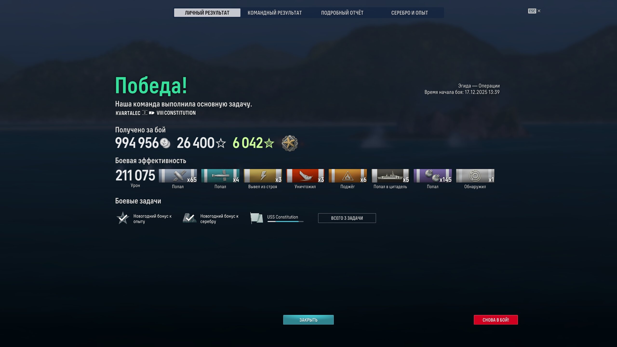 Скатал я тут "Конституцию" в операции. В первом бою раскрыться не успел, позорно потеряли"Руан" на Гермесе. Во втором бою с трудом победили. А уж в 3-м пришлось вертеться за команду, на последних минутах затонул от торпед. Правда урону наколотил и кораблей перед этим уничтожил довольно много. И ни одна операция не на все звезды. Кораблик усилил в ПМК, самое то против эсмов и крейсеров, да и линкорам неплохо заходит.