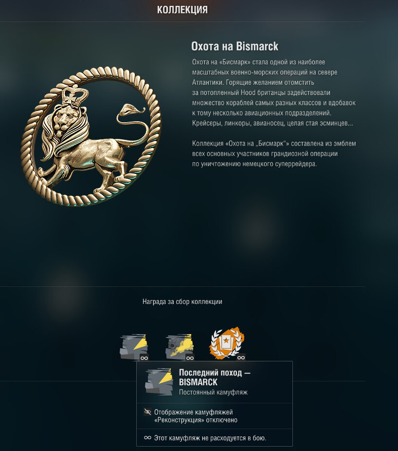 есть  например "угольная" коллекция "Охота на Бисмарк", за ее сбор выдаются пара камуфляжей - "Последний поход" и "На дне океана". В инфо к коллекции обозначено, что для их визуализации надо включить "глазик" на отображении камуфляжей "Реконструкция"
