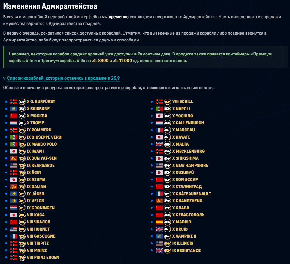 194 USS_Cole Help Team, Help Team 320 публикаций Жалоба #4 Опубликовано: 9 сен 2025, 02:12:23 Сегодня в 01:20:10 пользователь vfr_291 сказал: доброго всем. кто подскажет, почему в адмиралтействе у меня из неприобретенных кораблей только Sun yat- sen отображается. И из приобретенных ранее не все корабли показывает. за очки исследования нету кораблей к приобретению .куда подевался например Van Speijk? Его что вывели из продажи? Добрый день. В обновлении 25.9, в связи с переработкой интерфейса Адмиралтейства, часть кораблей временно выведена из продажи. Об этом заранее сообщалось в пачтноутах обновлений 25.7. и 25.8. Список кораблей которые остались в Адмиралтействе можно увидеть в патчноуте обновления 25.9 либо на данном скриншоте: Скрытый текст Ссылку на тему про корабли, которые непосредственно вывели из продажи, игроки вам уже любезно предоставили выше. Рассказать о публикации Ссылка на публикацию