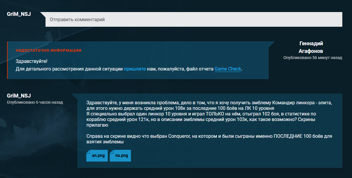8 [NAEZD] GriM_NSJ Участник 13 публикаций 1 496 боёв Жалоба #4 Опубликовано: 19 сен 2025, 04:15:03 Сегодня в 11:10:00 пользователь 1_StrelokRoland_ сказал: Закрадывается подозрение, что справа кроме коня 🐎 есть еще линкор Кремль ( на нем 33% ) Наверное вы на нем не играли , а цифры сами появились 🤔 - сильное колдунство )) На Кремле я играл до того, как взял цель забрать эту эмблему, а последние 100 боёв сыграны именно на коне, в этом и суть проблемы. В описании эмблемы есть условие - держать 108к урона ПОСЛЕДНИЕ 100 боёв, и эти 100 боёв были отыграны только на коне, на котором средний урон виден на скрине Сегодня в 02:52:40 пользователь Wobla35 сказал: В ЦПП не пробовали спросить? Они бы удовлетворили ваше любопытство. А мы можем только погадать Сейчас буду им писать заявку, изначально подумал что это я чего то не понимаю, но раз мне не пишут какой я "умный", то понял я всё верно) Рассказать о публикации Ссылка на публикацию