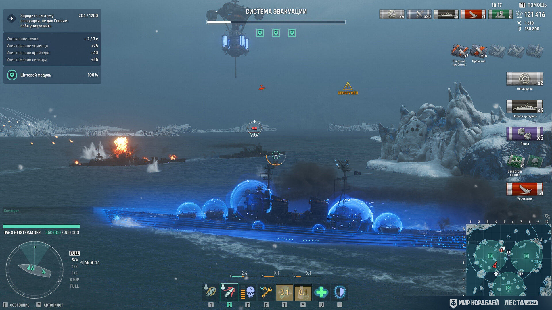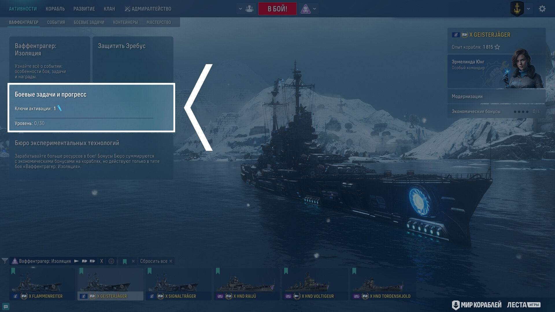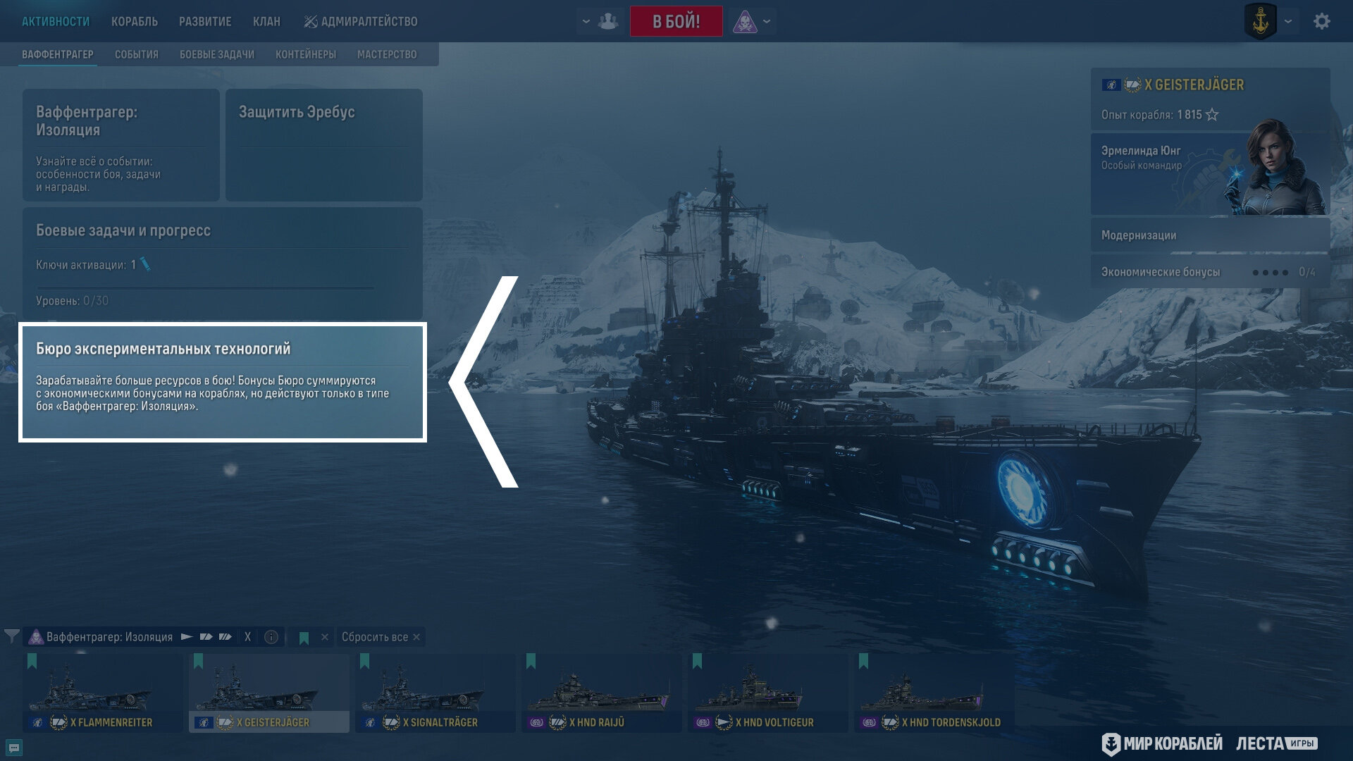 1 114 LESTA_MK Администратор 360 публикаций Жалоба #1 Опубликовано: Вчера в 10:00:00 Искру прогресса затушить Их гонит дикий страх. Но встретят в ледяной глуши Мой громовой раскат! Одна против вас всех... Могущественная секретная организация Альянс получила странный сигнал со своей заброшенной базы «Форт Эребус», находящейся на островах Гримсби в Южной Атлантике. Там был зафиксирован огромный всплеск странной энергии. Разведать обстановку отправили Джеймса Конрада — опытного оперативника этой организации и коммандера ВМС США. Причины всех происходящих на заброшенной базе аномалий были неизвестны, но одно руководству Альянса было понятно точно — если этот кто-то или что-то успеет выйти за периметр островов Гримсби с находящимися на базе документами, то всю организацию ждёт конец. Вместе с Гончими — элитным отрядом наёмников Альянса — Конрад отправился к базе. И там его ждал максимально неприятный сюрприз в виде Эрмелинды Юнг — дочери известного (скорее даже печально известного) инженера Макса фон Кригера. Она решила продолжить дело отца, дать отпор Альянсу и обнародовать найденные ей на базе секретные документы. Поскольку яблоко от яблони недалеко падает, гений Эрмелинды позволил ей подготовиться к встрече с кораблями-Гончими. Используя ресурсы заброшенной базы, свои чертежи, наработки флота Альянса и технологии семьи Кригеров, она создала три совершенных боевых корабля, оснащённых передовыми системами на основе электромагнетизма и квантовых феноменов. И если на стороне Гончих — их количество и вера в правое дело, то на стороне Эрмелинды — безумная мощь созданных ею кораблей. Столкновение неизбежно, кто прав — неизвестно, а кто выйдет победителем — непонятно. Чью же сторону выберете вы? А впрочем, вы можете попробовать обе и решить! В этой статье мы расскажем обо всех деталях временного типа боя «Ваффентрагер: Изоляция». Правила Начало: 1 окт., 05:00 МСК Окончание: 27 окт., 05:00 МСК Тип боя будет доступен в любое время в течение дня. Формат Шесть Гончих Альянса против одного корабля Эрмелинды. За Альянс можно играть в составе отряда. Максимальный размер отряда — 6 игроков. Остановимся подробнее на каждой из сторон конфликта. Эрмелинда Юнг Цель Зарядить систему телепортации «Фазовый мост» и сбежать от Альянса. Как достичь цели На карте размещены три генератора, аккумулирующие заряд системы телепортации «Фазовый мост». Управление каждым генератором осуществляется через захват соответствующей контрольной точки. Для ускорения победы Эрмелинде требуется сохранять под своим контролем генераторы, ведь каждый генератор не только копит заряд, но и усиливает щитовой модуль её корабля. Уничтожение кораблей Гончих также ускоряет зарядку «Фазового моста». Целевое значение заряда системы — 1200 единиц. Заряжается система, как мы сказали выше, двумя способами. 1) Уничтожение Гончих. Каждый потопленный корабль Альянса увеличивает заряд системы: +25 ед. за уничтожение эсминца; +40 ед. за уничтожение крейсера; +55 ед. за уничтожение линкора. 2) Захват и удержание контрольных точек. Каждая контрольная точка генерирует 2 единицы заряда системы в 3 секунды. Захваченные Эрмелиндой генераторы также поддерживают её щитовой модуль, который поглощает урон. Если под контролем Эрмелинды все три точки, то щитовой модуль её корабля заряжен на 100% (то есть у её кораб