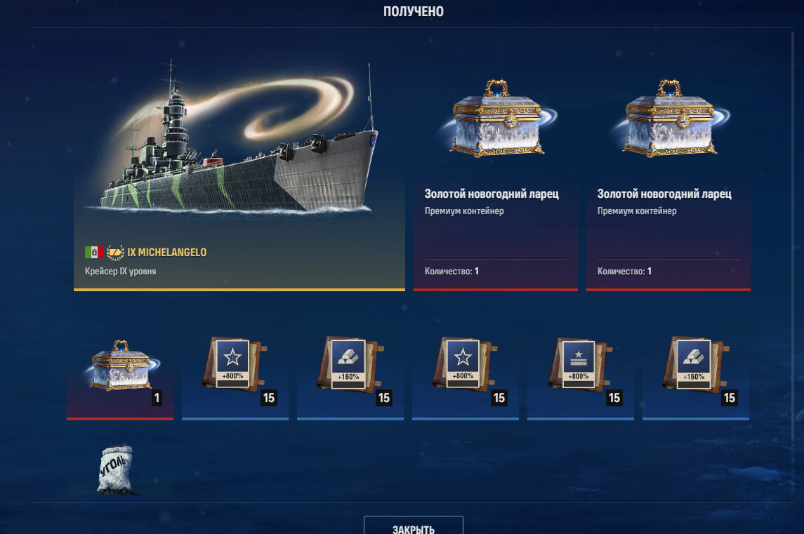 504 [_ROSS] Edremelech Участник 441 публикация 7 735 боёв Жалоба #875 Опубликовано: 11 янв 2026, 21:31:20 Вчера обнаружил, что за цепочку "Ключевая цель" давали золотой ларец Соответственно, вчера и сегодня шпилил в рандоме, что при моих кривых руках - просто позор и подстава команды. Однако вышло не так плохо, как я опасался, примерно 40% побед :) К тому же я заработал свободного опыта на Нахимова, которого давно ждали "Плюканский" камуфляж и Йеф с Би :) И кучу серебра на лишний супер Насбивал снежинок на второй ларец. Акция "не наелся - не налижешься"! А что, еще один мелкопрем. Их у меня уже больше, чем осталось. Скоро буду фармить вторую группу, а она всегда окупается! 2 Рассказать о публикации Ссылка на публикацию