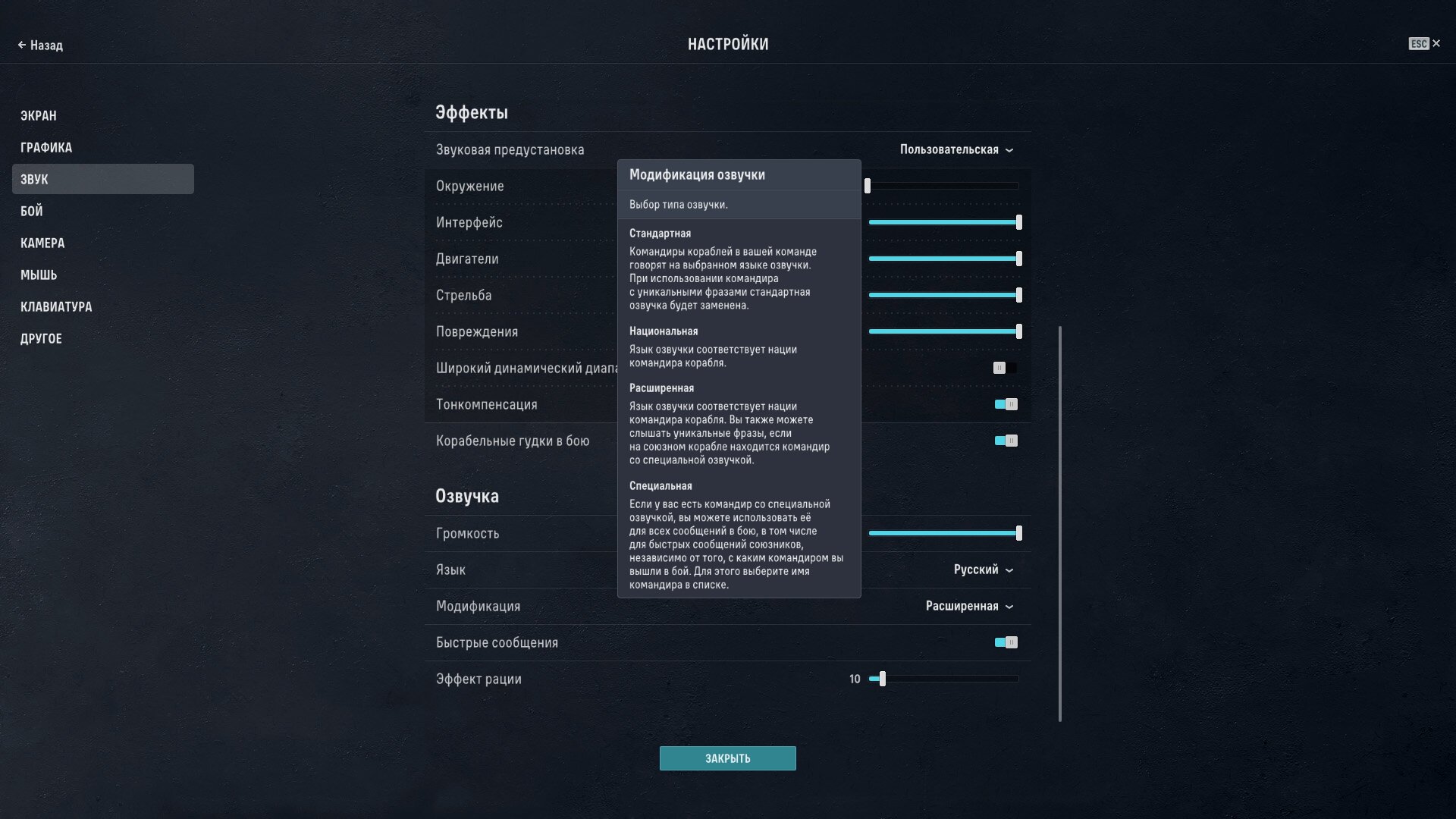3 226 [GREML] MoGwaai Участник, Коллекционер 1 770 публикаций 11 010 боёв Жалоба #16 Опубликовано: 21 янв 2026, 16:44:02 Сегодня в 17:22:48 пользователь Zemlia_Nebo_Voda сказал: Я запутался, нужна пояснительная бригада: Скрытый текст Правильно ли я понимаю, что: 1) Стандартная = союзные командиры говорят на Русском, вне зависимости от Нации кораблей, при этом - если игрок вышел с особым командиром - его озвучка будет особой. 2) Расширенная = командиры союзников говорят на своих Национальных языках, если же союзники с особыми командирами - тогда особая озвучка заменяет Национальную. Командир игрока так же особая. 3) Специальная - вся озвучка союзников, а так же - игрока - будет особой, выбранной в настройках - без разницы, какие командиры - игрока \ союзников не учитываются. ? Расширенную не пробовал - не скажу. При выборе стандартной озвучка зависит от того, какой конкретно командир выбран для корабля, на котором вы выходите в бой. Озвучка будет зависеть только от этого. Если у командира своей озвучки нет, то озвучен он будет стандартно в соответствии с выбранным языком. При выборе специальной ваши комадиры будут озвучены в соотвествии с конкретной выбранной озвучкой вне зависимости от того, кто конкретно сидит на корабле. Например, вы выставите озвучку кого-то из AL. Если на корабле сидит не азуровский командир, озвучка все равно будет в соответствии с выбранной в настройках. Даже если у этого командира есть своя. 1 Рассказать о публикации Ссылка на публикацию
