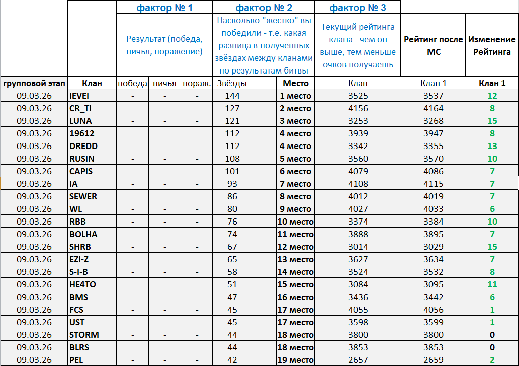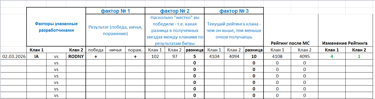141 ZaryaVVS Участник 60 публикаций 28 320 боёв Жалоба #11 Опубликовано: 5 мар 2026, 08:56:53 В 02.03.2026 в 13:16:02 пользователь POCT сказал: Решил сам найти ответ, собрав открытую статистику результатов МС. Исходя из ответа разработчиков подготовил следующую таблицу, которую буду постепенно наполнять своими данными. Эти данные помогут определить значимость каждого фактора, влияющего на изменение рейтинга. Чем больше будет статистики, тем точнее будет определено влияние каждого фактора. Если у вас есть желание помочь со сбором статистики, то прошу постить в этой теме результаты МС ваших кланов. Обязательно нужны данные: 1) рейтинг обоих кланов до МС 2) скриншот результата МС 3) рейтинг обоих кланов после МС Все проще: за победу с разницей >= 20 звезд дается 7 очков рейтинга (редко по 6, причина - государственная тайна); за победу с разницей <20 звезд дают 4 очка; за ничью и поражение дают 1 очко; в групповом этапе дается количество очков в зависимости от набранных звезд 1 Рассказать о публикации Ссылка на публикацию