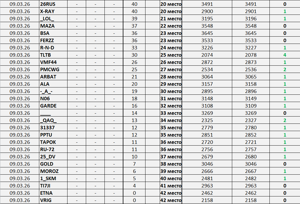 971 [IA] POCT Участник 369 публикаций 18 380 боёв Жалоба #12 Опубликовано: 5 мар 2026, 14:19:55 Сегодня в 11:56:53 пользователь ZaryaVVS сказал: Все проще: за победу с разницей >= 20 звезд дается 7 очков рейтинга (редко по 6, причина - государственная тайна); за победу с разницей <20 звезд дают 4 очка; за ничью и поражение дают 1 очко; в групповом этапе дается количество очков в зависимости от набранных звезд Спасибо за информацию. Буду наблюдать, интересно разобраться в каких случаях получается 6 очков. Рассказать о публикации Ссылка на публикацию
