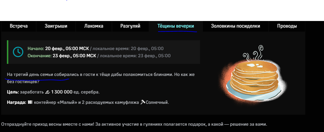 970 LESTA_MK Администратор 509 публикаций Жалоба #1 Опубликовано: 16 фев 2026, 08:00:00 Провожаем зиму праздничными активностями. Весна уже совсем близко, и это значит, что нас ждёт ещё один праздник. Ищите специальные задачи в клиенте игры во вкладке «Масленица»! Начало: 16 февр., 05:00 МСК Окончание: 23 февр., 05:00 МСК Проводы зимы Каждый день в течение Масленой недели открываются новые боевые задачи. Выполните их в срок и заберите награды, приуроченные к празднику: до 10 расходуемых камуфляжей «Солнечный», полезные контейнеры и запасы ресурсов. Отпразднуйте приход весны вместе с нами! За активное участие в гуляниях полагается подарок. Читать на портале 9 3 1 1 1 Рассказать о публикации Ссылка на публикацию