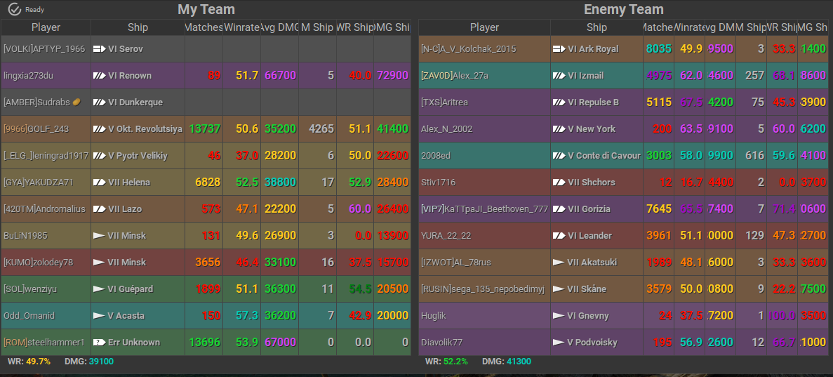 в большей части боев первое место среди проигравших, с уроном по моему засвету около 100к плюс-минус, последний бой был 130к  по засвету и 100+к торпедами... не в классе дело , а в том что ВБР постоянно примерно в 70% боев дает вот такое чудо в командах, были бои где просто вся команда красная.