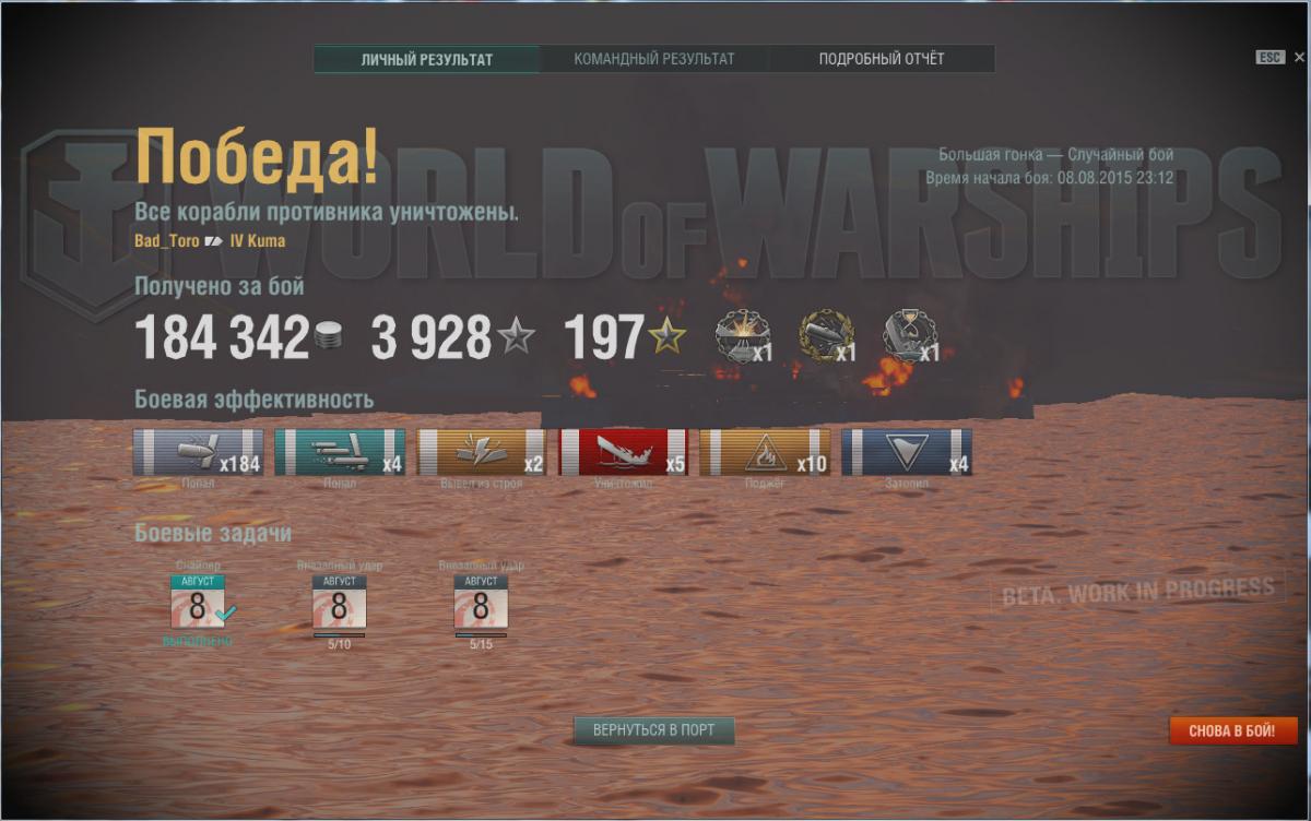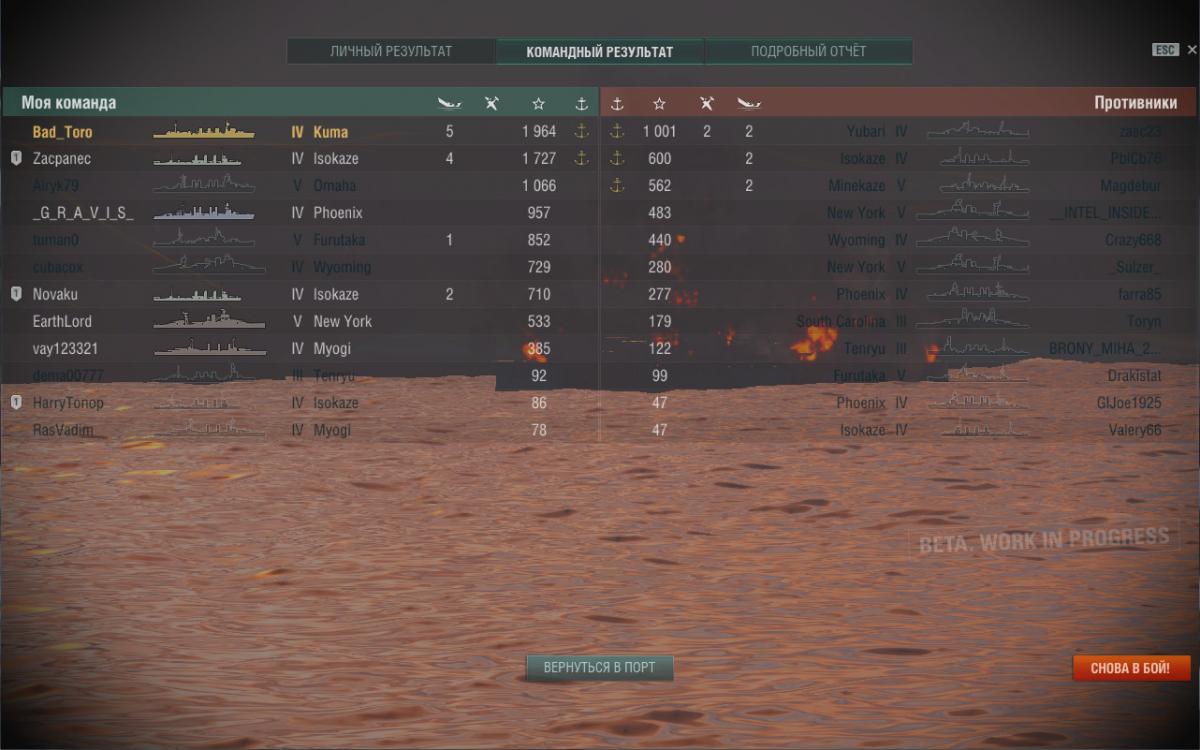 Я тут на Куме тожеть оторвался эсминчика вальнул потом в островок упоролся пока барахтался сбил пять торперов, которые на "халявку" позарились, потом из за угла линкор подгрёб 3км дистанции получил торпедосов по самую ватерлинию. Затем ББхами несколько цитаделей выбил из какой то крейсерши ну и на закуску утопил оба авика "ибо нефиг торпами мазать в неподвижного меня. Карч кайфа получил огромное множество. Дык я к чему веду