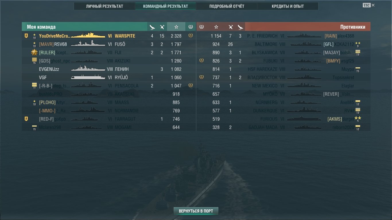 А Warspite что делает в компании этих корыт? По поводу американских линкоров я полностью, но Warspite как раз неплохо играется даже с 8-ми уровнями. Он точный, имеет хорошую маскировку и достаточно маневренный. Скорость, конечно, не особо, но именно маневренность очень годная, так что можно вполне успешно не подставляться.