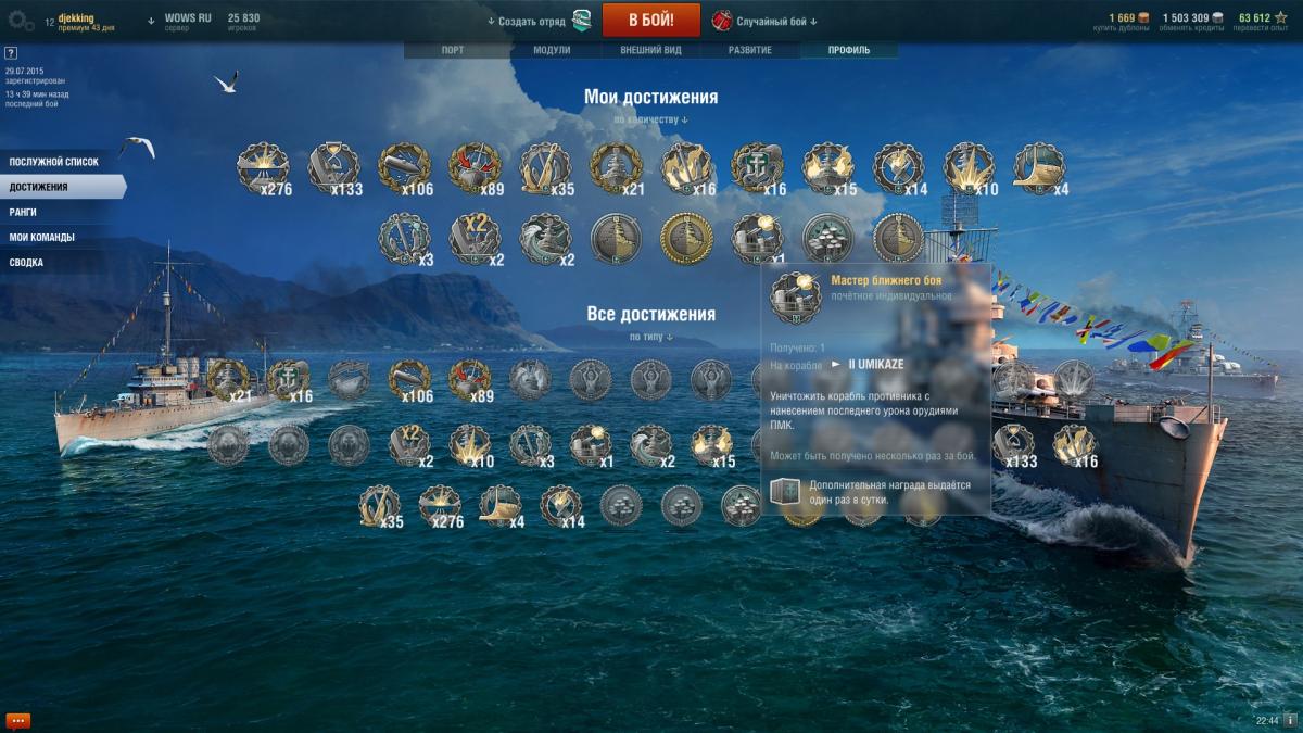 Теперь коснусь другого достижения, которое наоборот обесценилось. Это достижение "Мастер ближнего боя". Раньше для получения этой медали нужно было серьёзно попотеть, корабль должен был быть неплохо упакован модулями и навыками капитана, чтобы увеличить дальность и мощность ПМК. Ведь совсем недавно нужно было "уничтожить корабль противника, нанеся более 20% урона его боеспособности с помощью орудий ПМК." Даже в разделе "Обучение" на сайте по-прежнему висит эта информация. То есть взяв среднестатистичный эсминец, ему нужно было умудриться срезать из вспомогательного калибра, при всей его косости, около 3000 очков боеспособности, при этом не пойти на дно от пущенных с близкого расстояния торпед.
