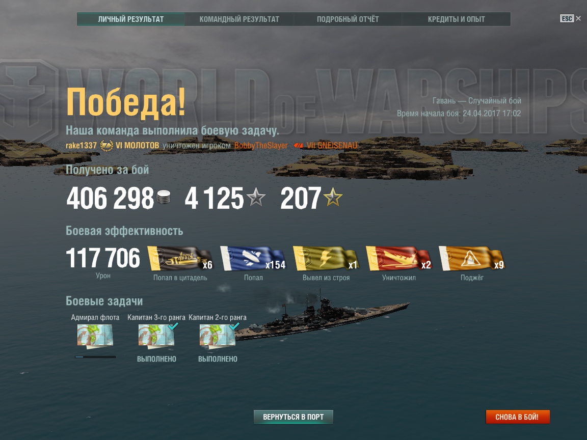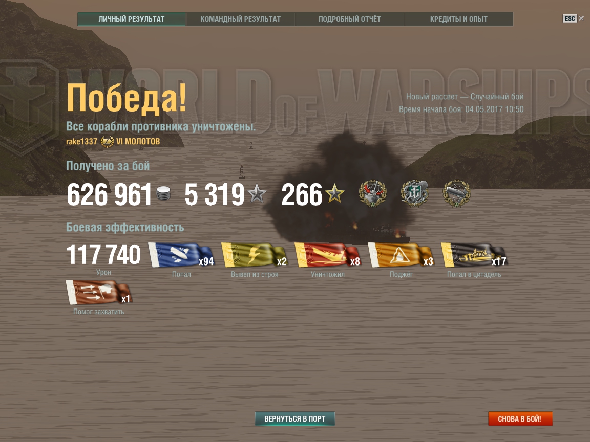 Небольшой пруф, которые часто запрашивает у меня уважаемый neloz666, после критичного изучения моих баек на форуме...Конечно, результат не рекордный, но первый раз мне удалось подобраться к 100К на Молотове. Чуть не дотянул, авик опередил со Шпее....В этом бою был ряд интересных моментов, которые отражают, на мой взгляд плюсы - минусы Молотова и вообще его геймплея на разных уровнях. Перед этим боем было некоторое унижение и слив с 8 в режиме Эпицентр, здесь были только 5-6.Также - надо было добрать 26К до завершения Охоты за Бисмарком, однако Молоток решил этот вопрос одним ударом....