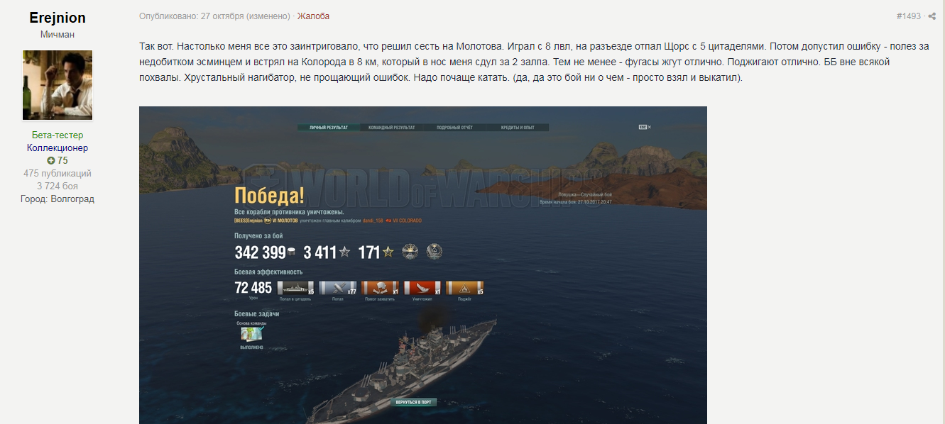 :Smile_medal: Какой наблюдательный :Smile_honoring: . Чисто субьективно иногда кажется что да, однако цитаделей стало меньше после изменения баланса уровней само собой, раньше как Молотов был в топе то крушил четвёрки как семечки. Я уже писал выше, что средний настрел у меня лично упал после ребаланса. Однако скринов у меня гораздо больше чем 5, есть с большим настрелом но мало потопленных, есть где Молот №1 в дебрифинге, но в проигравшей команде. Сложно посчитать. Вот если бы по нескольким сотням боёв графики строить, тогда может что и выплыло бы. Но у меня нет таких данных, а разрабы их не светят вроде. По стате на сервере не так понятно, потому что класс игроков непонятен, и результаты сильно усредняются.