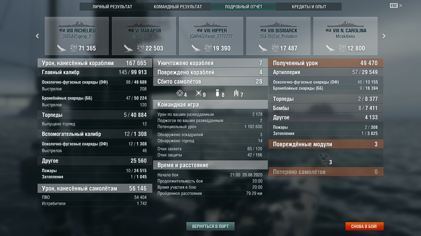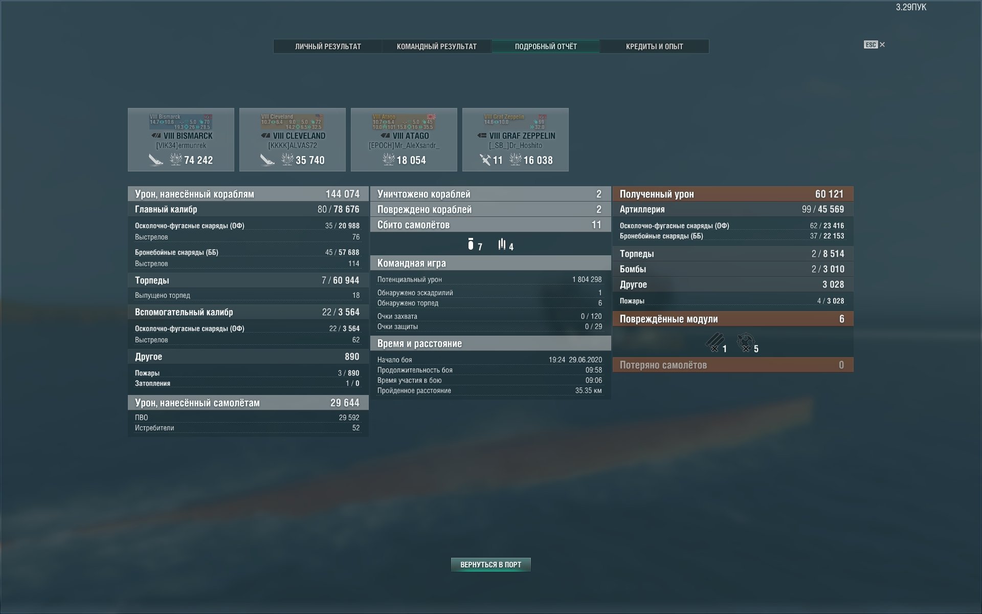 В итоге 44 сбитых ПВО + 4 истребутелями = 100к урона по самолётам и при этом словил только 3 торпеды от него