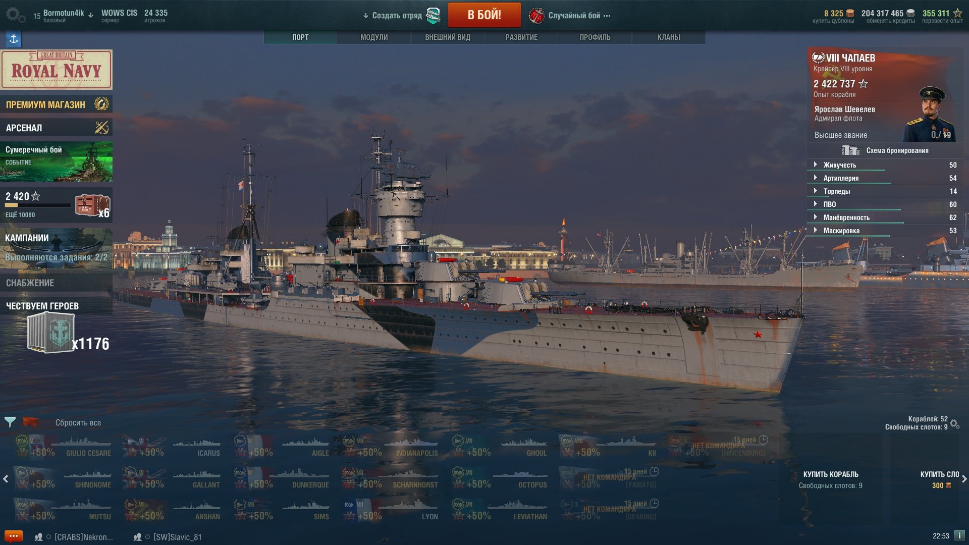 В порту - 52 корабля (считая 3 для спецрежимов и 3 для клановых боёв), однако, хотя бы по одному бою проведено только на 24-х. Играю чуть больше года, даже с учётом всех кораблей из ивентов, количество кораблей вряд ли выйдет за показатель в 40 штук.