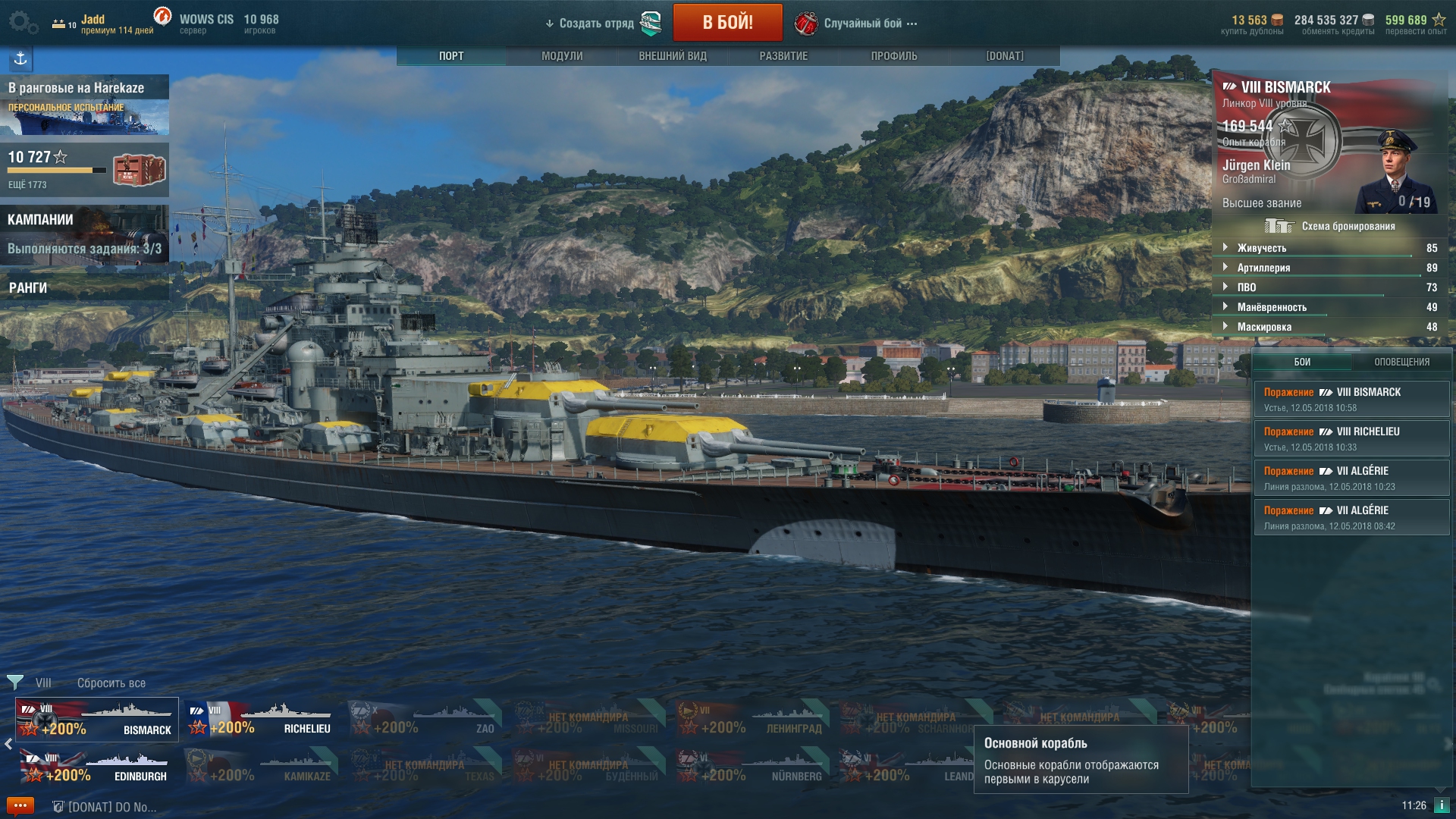 Я когда качал ветку, читал, что Хабаровск - самая имбовая десятка. А когда выкачал, оказалось его понерфили жестко. Где торпеды на 8 км?  Где рули, неповоротливый жуть. Помню первый сезон КБ, Хабаровск, моя единственная десятка, очень некомфортно было на нем. Сейчас дело другое, я же качаю не как все люди, взял ветку и качать её, а все подряд равномерно сбивая x2. Так что тут пока скидки выкупил 4 десятки, всего в порту 9 ( 3 советских, 3 японских, оба француза и Минотавр),выкачаны но не куплены из за нехватки серебра  Курфюрст и Гинденбург, и на подходе 3 девятки американских разной степени прокачанности. Подошло все косяком, так сказать.