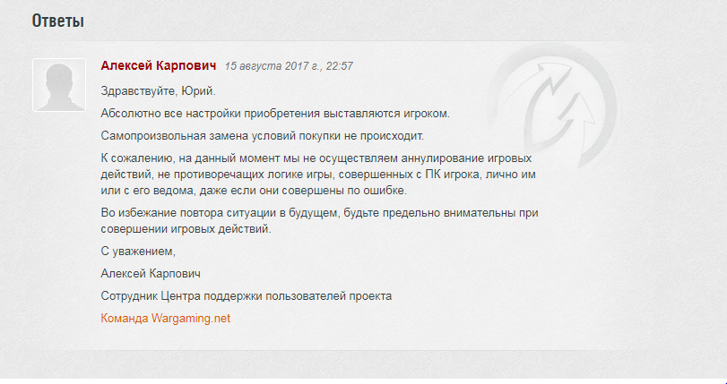 4 898 [NTTSU] grozny37 Участник, Бета-тестер кланов 4 514 публикации 43 530 боёв Жалоба #43 Опубликовано: 15 авг 2017, 19:24:59 1 минуту назад, Lord__Garikson сказал: у меня стояло пополнение за кредиты но по каким то акциям получил голдовые расходники и когда они закончились списали дублоны на вопрос о возврате ЦПП дал ответ что надо следить за тем что у вас стоит короче типо сам виноват что переключилось с кредитов на дублоны короче сколько не писал ответ один и то же вежливо послали меня в ту степь куда Макар телят не гонял как получу ответ-- выложу сюда...наверно, тоже самое будет Рассказать о публикации Ссылка на публикацию